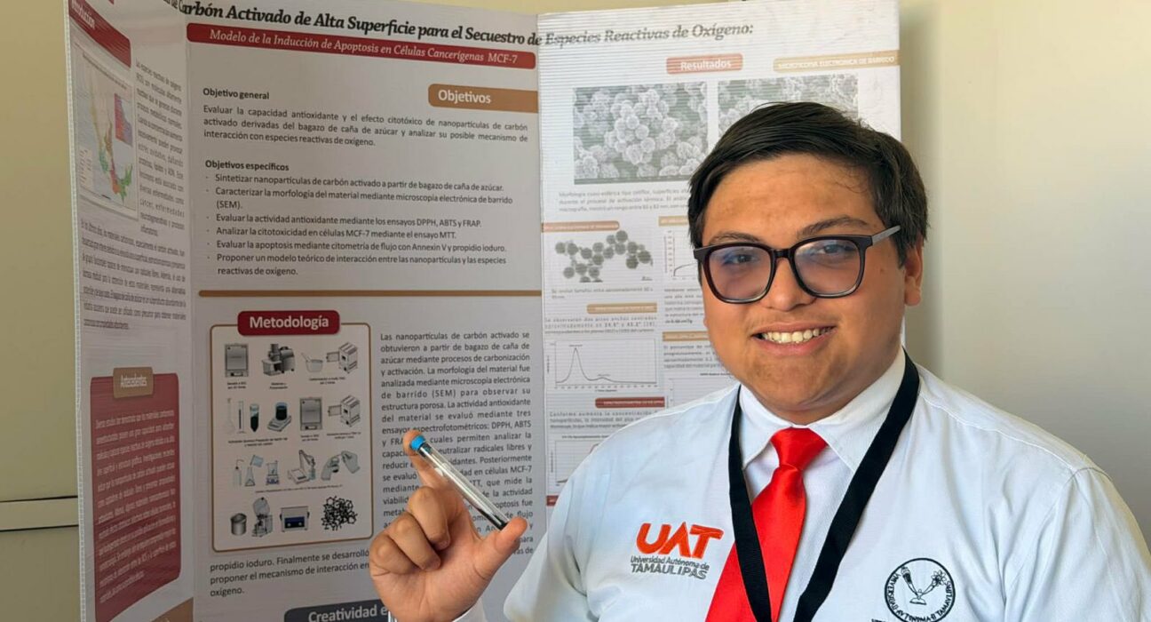 El alumno de la Escuela Preparatoria Mante de la UAT presentó con éxito su proyecto enfocado en la síntesis de nanopartículas de carbón activado, una línea de investigación aplicada al estudio de procesos asociados al cáncer.